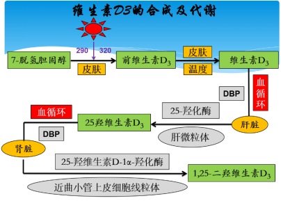 我們首先從維生素D談起。維生素D有兩類,膽骨化醇即維生素D3,和麥角骨化醇即維生素D2兩者的區(qū)別在于化學(xué)結(jié)構(gòu)不同,但兩者的生物活性相類似。本文中涉及到的維生素D主要指維生素D3內(nèi)源性維生素D3的合成依賴于陽光紫外線的光合作用。在紫外線作用下,皮膚中的7-脫氫膽固醇(原維生素D3)上的C9—C10三鍵斷裂形成前維生素D3,前維生素D3在皮膚內(nèi)經(jīng)過一晝夜的熱平衡轉(zhuǎn)化成維生素D3。此時的維生素D3還不具備生物活性,須與維生素D結(jié)合蛋白(DBP)結(jié)合,經(jīng)血循環(huán)到達(dá)肝臟,經(jīng)腎臟近曲小管轉(zhuǎn)變成1,25-(OH)2-D3才具有生物活性。也就是說維生素D3在體內(nèi)的完整代謝通路經(jīng)過了三個器官:皮膚、肝和腎。通過三步反應(yīng):一步光化學(xué)反應(yīng)和兩步酶促的羥化反應(yīng),最后轉(zhuǎn)變成激素形式的1,25-(OH)2-D3,才能發(fā)揮生物效應(yīng)。由此可以看出維生素D其實(shí)是一種激素,而非維生素。