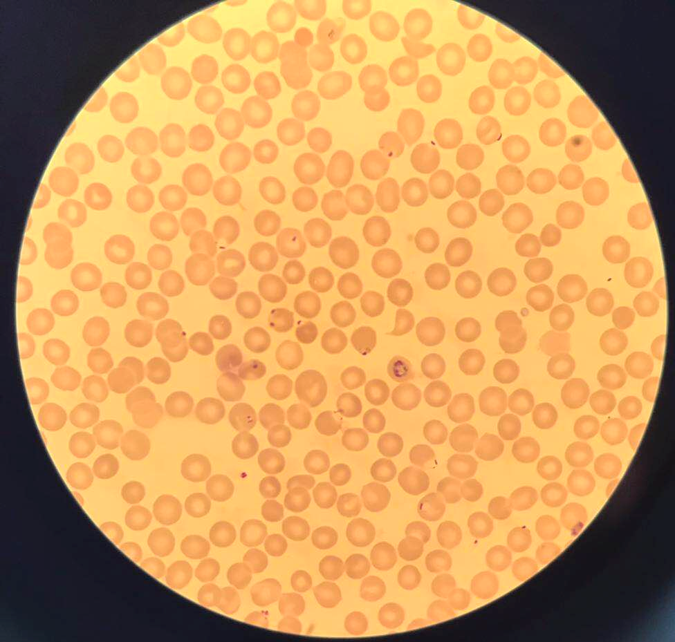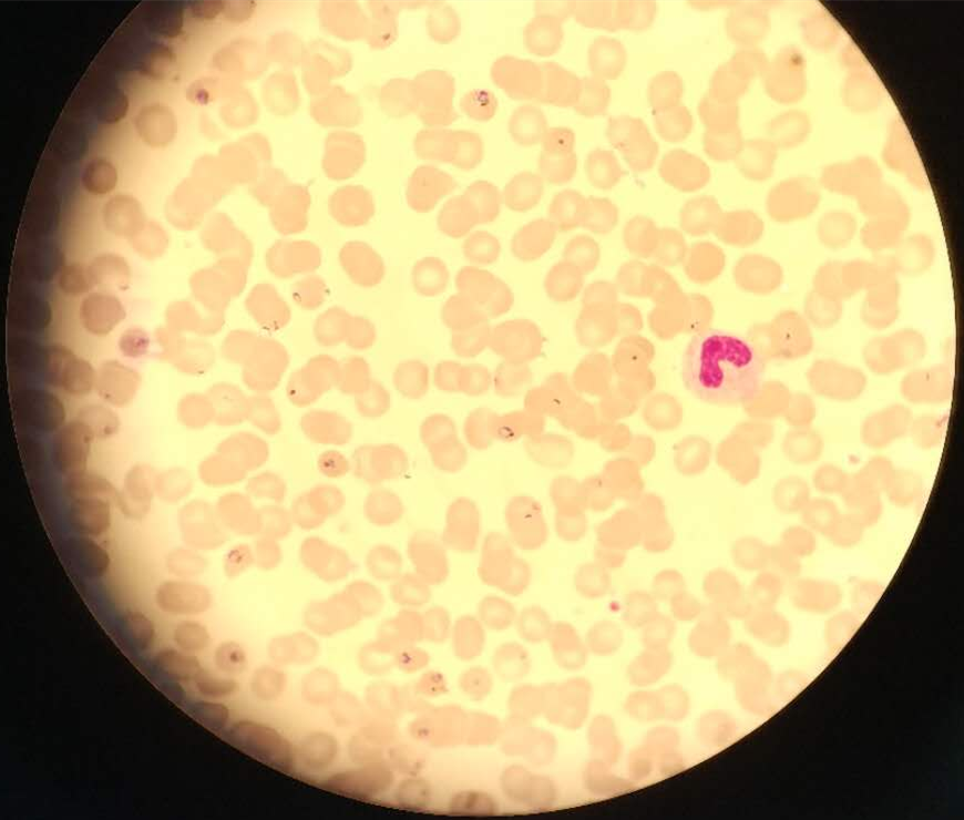 患者在ICU病房“外周血細(xì)胞形態(tài)學(xué)圖片”(成熟紅細(xì)胞中可見瘧原蟲環(huán)狀體)