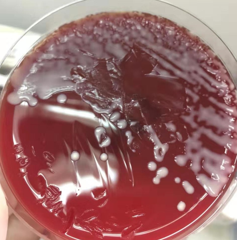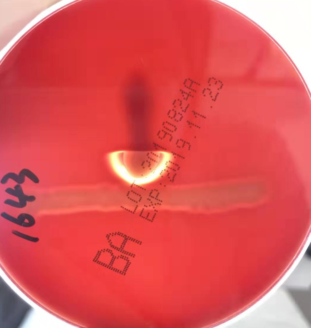 馬紅球菌在血瓊脂平板上可形成濕潤、粗糙、光滑或者粘液型菌落。CAMP試驗呈強陽性是鑒定馬紅球菌的重要試驗。見(圖1.圖2)。