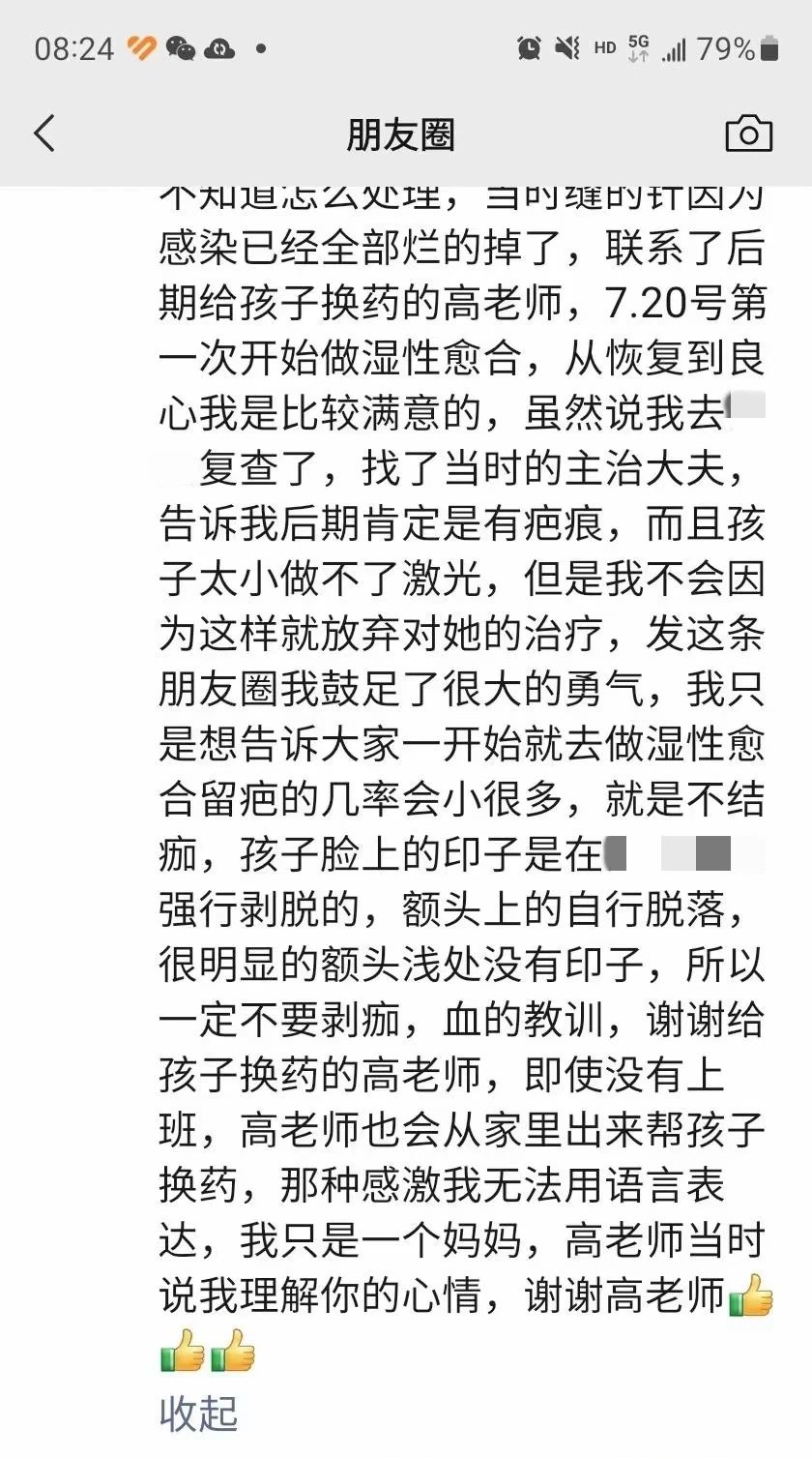 我院傷口造口門診接診了一名頭面部擦傷的兩歲半患兒,通過采取濕性愈合理念+密閉式愈合方法,經(jīng)自溶性清創(chuàng)及抗感染治療后促進了傷口愈合,孩子媽媽難掩感激之情,在朋友圈這樣說......