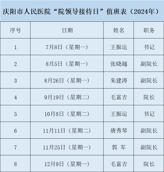 現(xiàn)將慶陽市人民醫(yī)院“院領(lǐng)導(dǎo)接待日”具體情況公告如下: