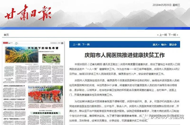 健康扶貧:脫貧先祛病。2018年市醫(yī)院健康扶貧幫扶對象涉及4縣64個鄉(xiāng)鎮(zhèn)幫扶點及若干貧困戶,抽調(diào)104名各學(xué)科的專家精英、業(yè)務(wù)骨干為扶貧專家,進村入戶為困難群眾看病約400余次,接診患者3萬多人次。形成了健康扶貧合力攻堅、上下聯(lián)動積極推進、督導(dǎo)調(diào)研精準(zhǔn)幫扶、政策宣傳人人知曉、健康扶貧落地生根的良好效應(yīng)。市醫(yī)院健康扶貧工作先后在《今日頭條》《甘肅日報》《隴東報》以及新媒體印象慶陽網(wǎng)、市政府網(wǎng)站、市衛(wèi)計委網(wǎng)站等圖文報道。