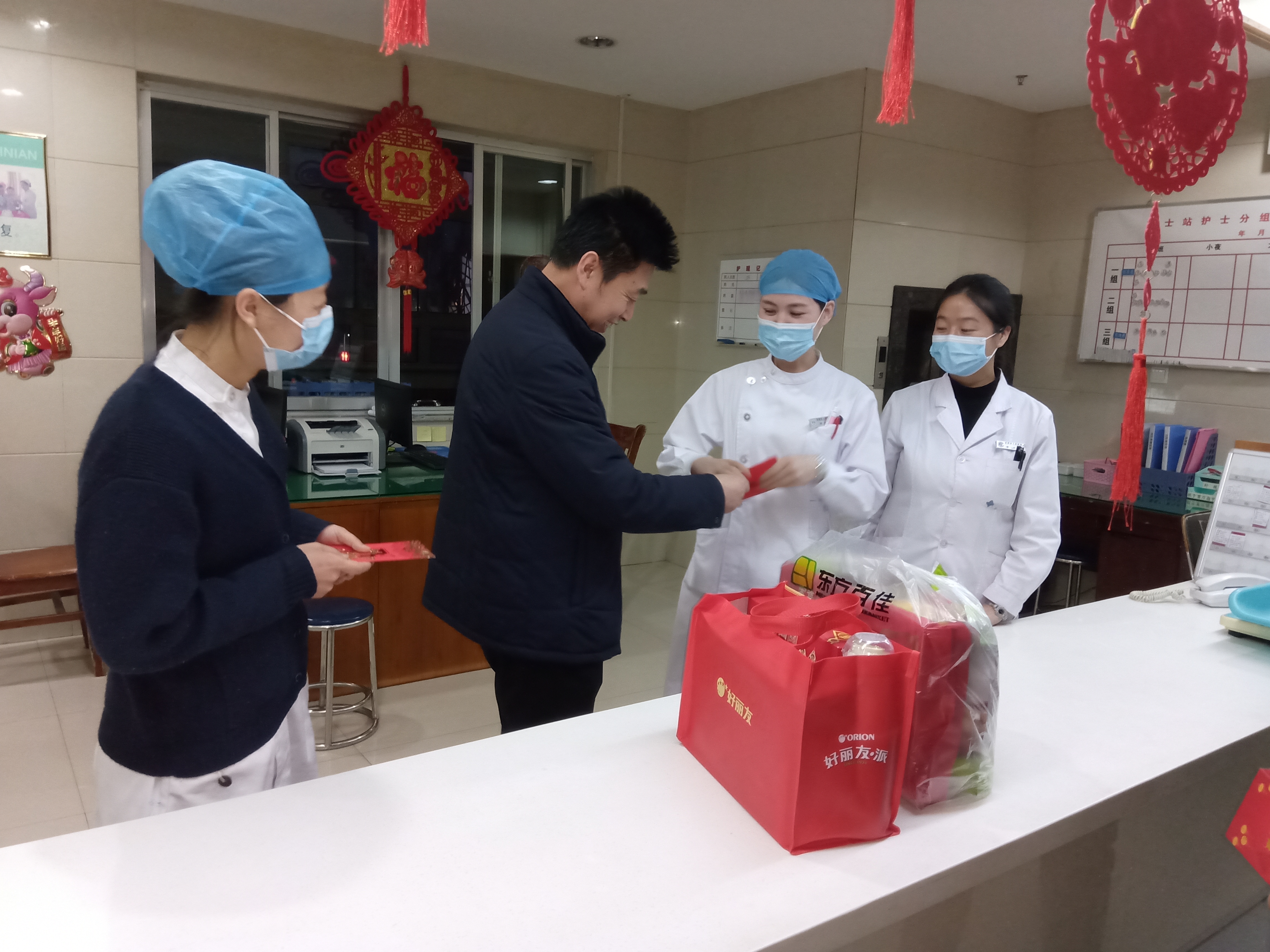 院領(lǐng)導(dǎo)親切詢問值班人員節(jié)日期間的工作和生活安排,在普外科、在心內(nèi)科、在神經(jīng)外科……每到一處,暖暖的問候、深情的祝福、爽朗的笑聲,如汩汩涓流,流淌在醫(yī)院的各個(gè)角落。一句句樸實(shí)的“過年好”,表達(dá)對(duì)新春佳節(jié)的問候;一句句真誠(chéng)的“辛苦了”,承載對(duì)廣大堅(jiān)守崗位醫(yī)護(hù)人員的感謝。盡管不能全家團(tuán)圓,但是每個(gè)值班人員依然感受到了家一般的溫暖!