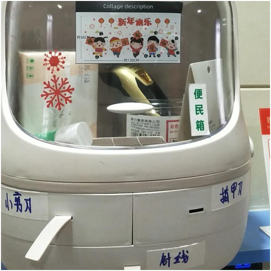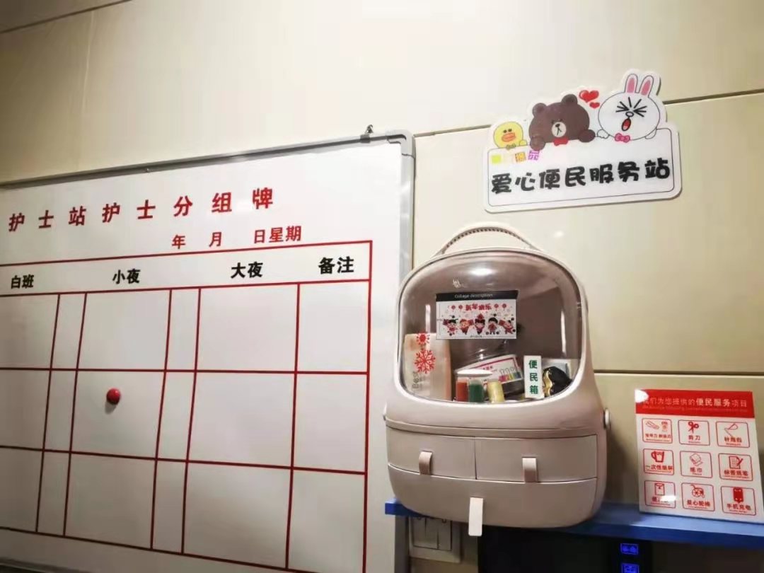 在普外科護(hù)士站,有一處圖文醒目的“愛(ài)心便民服務(wù)站”,那里有一個(gè)小小的“便民箱”,里面盛放著指甲剪、剃須刀、剪刀、一次性紙杯、針線包、便簽紙和筆等物件。