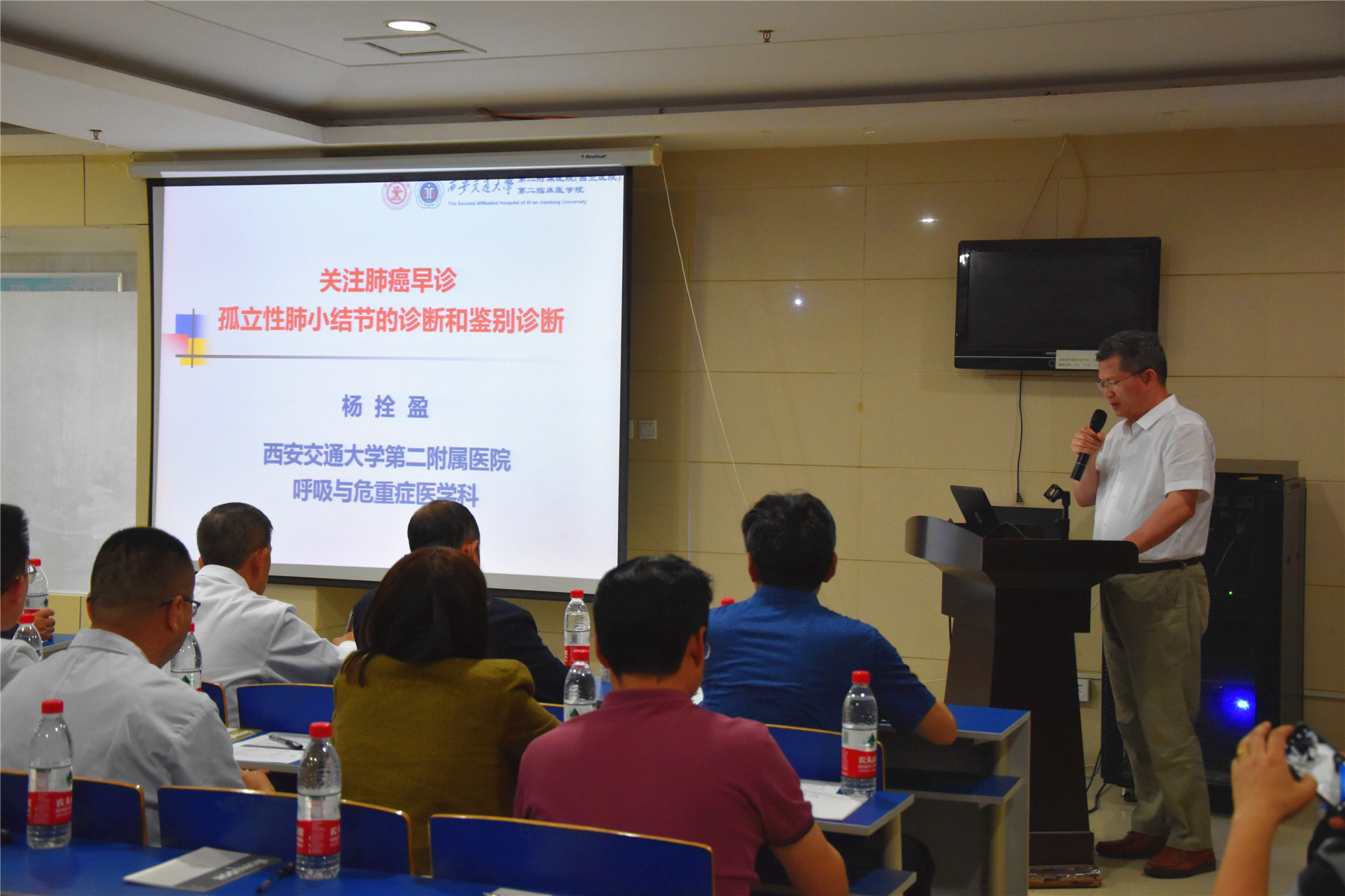 楊栓盈教授以《關(guān)注肺癌早診——孤立性肺小結(jié)節(jié)的診斷和鑒別診斷》為題做學(xué)術(shù)講座。我院胸心外科、呼吸科、腫瘤科、放療中心的青年醫(yī)師分別做病例分享,現(xiàn)場(chǎng)各學(xué)科專家進(jìn)行了熱烈的病例討論。