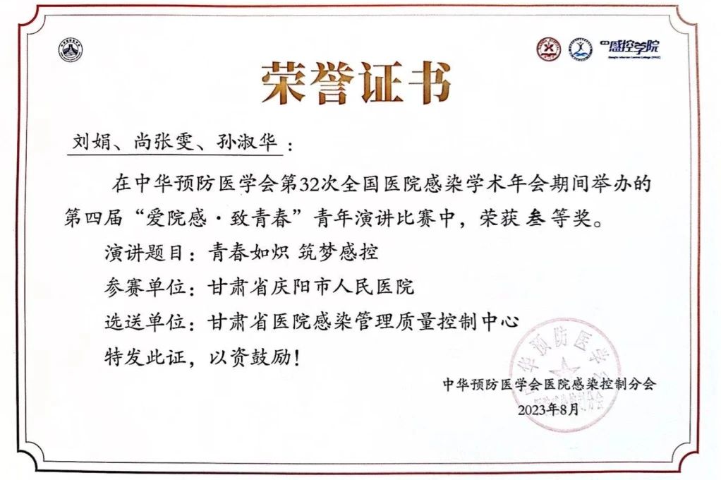 為大力弘揚(yáng)醫(yī)院感染管理科技工作者的奉獻(xiàn)精神,傳播醫(yī)院院感文化,今年3月,由中華預(yù)防醫(yī)學(xué)會(huì)醫(yī)院感染控制分會(huì)主辦的第四屆“愛院感·致青春”演講比賽正式啟動(dòng)。經(jīng)過層層篩選,慶陽(yáng)市人民醫(yī)院劉娟、尚張?chǎng)、孫淑華三名選手代表甘肅省參加了8月14日-8月18日在南京舉辦的全國(guó)大賽。