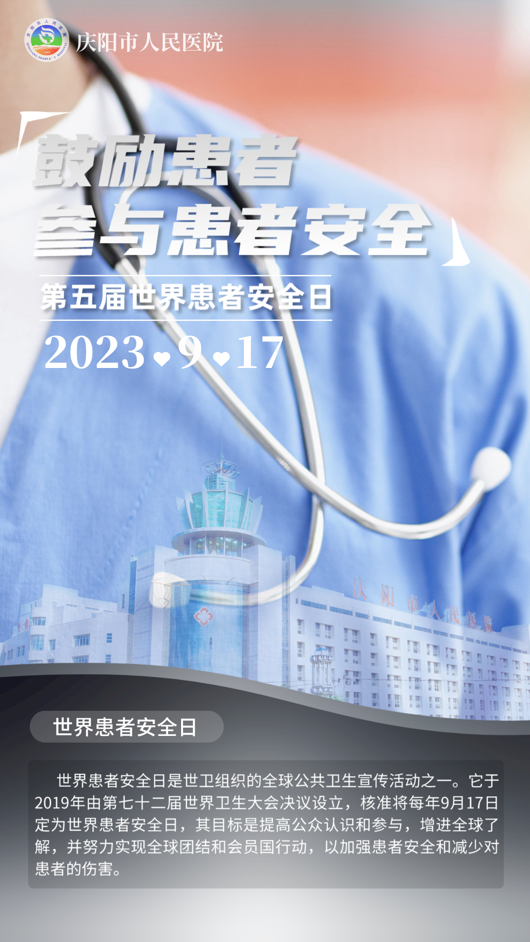 2023年9月17日是第五個(gè)世界患者安全日,活動(dòng)主題是“鼓勵(lì)患者參與患者安全”,口號(hào)是:提升患者的聲音,行動(dòng)目標(biāo)包括:在各級(jí)各類醫(yī)療機(jī)構(gòu)中,給予患者和家屬專業(yè)知識(shí),提高患者、家屬和照護(hù)人員的參與度,借此提高患者安全程度。